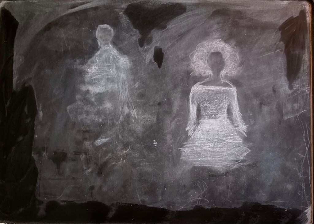Op een klein tekentabletje maakte kleindochter Anna met een krijtje in een paarminuten dit krijttekeningetje al vegend en tekenend. Daar maakte ik dit verhaaltje bij.