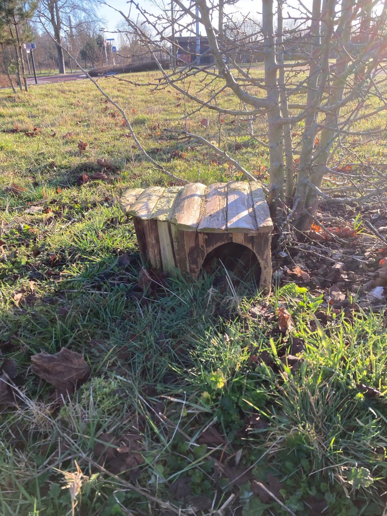 Naast me kwam een jonge vrouw staan die haar hond aan het uitlaten was. Zij haalde me uit mijn fantasieën. Ze vertelde dat het een egelhuisje was. Ik vroeg haar waarom er voor egels huisjes geplaatst worden. Ter bescherming, zei ze. Maar waarom? Egels hebben zichzelf toch altijd uitstekend gered, vroeg ik. Ze hield haar telefoon voor mijn neus. Ze had het razendsnel opgezocht op AI: Egelhuisjes worden geplaatst om egels een veilige, droge en beschutte plek te bieden om te schuilen, te slapen en te overwinteren. Door verstedelijking en opgeruimde tuinen vinden egels minder natuurlijke netstplekken las ze hardop. Ik hield mijn scepcis maar wilde de vrouw niet haar enthousiasme ontnemen. Leuk he, zei ze. Ze vertelde dat ze zelf ook zo’n huisje in haar tuin had. En dat dat zo gaaf is. En dat je ze geen melk moet geven maar water. En dat dat geritsel in de tuin zo mooi is. En dat ze hoopte dat er een keer jonge egeltjes zouden komen.