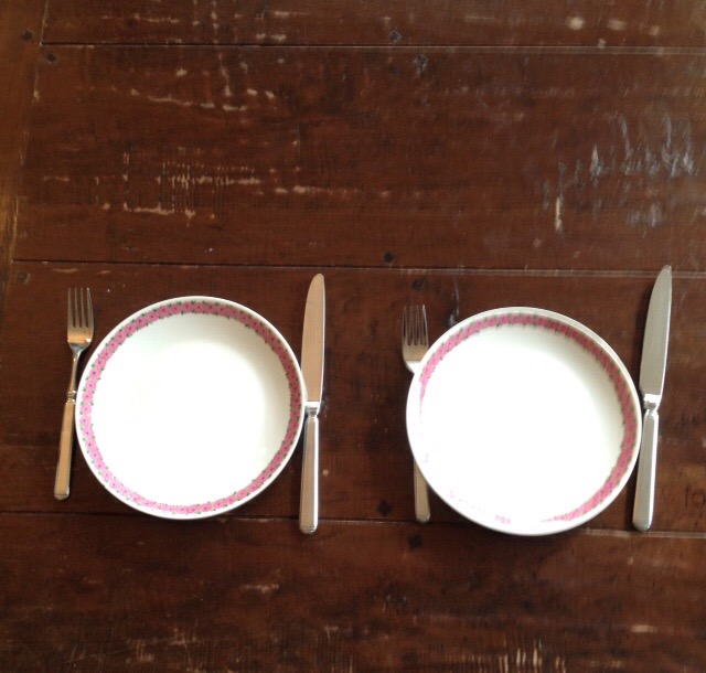 Twee borden, twee messen, twee vorken. Glazen voor de thee. Halvarine. Gesneden brood in een mandje. Kaas, rosbief, salade, jam. Ik kan gelijk aan tafel.