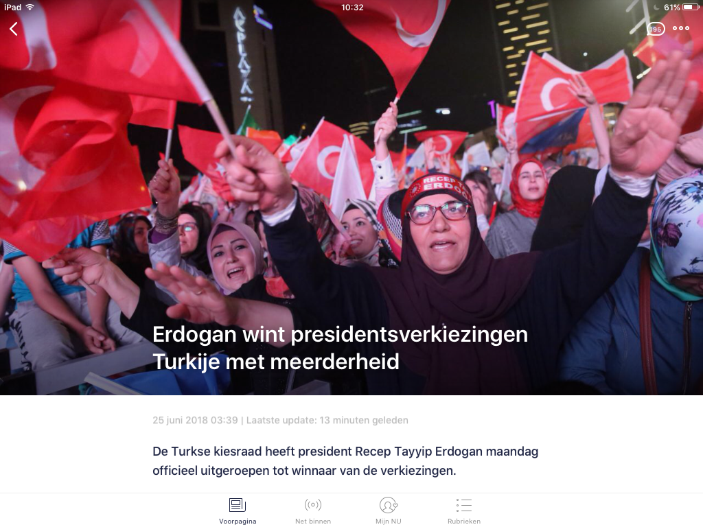 Waarom kiezen Nederlandse Turken voor 70% een dictator? De stemmen vanuit Nederland zouden Erdogan wel eens in het zadel kunnen hebben geholpen. In eigen land was zijn meerderheid niet zo groot. In geen enkel land in Europa krijgt Erdogan zo veel stemmen( percentagegewijs). De verontwaardiging op de media is groot. Ozcan Akyol schrijft in het AD vanmorgen: Wat is er aan de hand dat hier gestemd wordt op een man die vrijheden inperkt, tegenstanders uitschakelt, mediabedrijven intimideert en opdoekt, andersdenkenden de mond snoert, gevangenzet. Waarom is men zelfs trots op een dictator? Ebru Umar, Joris Luyendijk, Guus Kuyer, Nadia Bouras, Wierd Duk twitteren er over vanmorgen. Nijverdaller Gerwin Berenschot vraagt zich af of een stem voor Erdogan eigenlijk een stem tegen iets anders is. Ik denk dat ik een eind mee kan gaan. Dat wij ooit ons neerlegden bij de Basisvorming was omdat we murw waren. Weer een verandering van bovenaf. Er werd niet geluisterd. We wisten dat het gewoon door zou gaan. Weeeeer een onderwijsverandering. Mensen laat gaan, zoek het uit. Okee jullie willen de Basisvorming? Vooruit je kan hem krijgen. We doen gewoon lekker ons ding en verder zoeken jullie het maar uit. En af en toe deelden we een steekje uit en saboteerden we als daar ruimte voor was. Zo gaat dat: je buigt het hoofd, maakt er wat van en denkt het zal wel. En af en toe deel je een tikje uit.