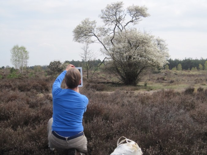 ” En wat voor boompje of struik wil je voor?” Mijn tuinman zat met een kladblok aan tafel en vroeg door. “Wat is je favoriete boom?”. Ik was wel een beetje uitgedacht over tegels, plantjes en struiken. Het duizelde me na een paar uur boven de ontwerpschets van de tuin achter mijn nieuw te bouwen huis. Waar alles moest komen te staan en wat dat allemaal moest gaan kosten. Als hij iets voorstelde zei ik steeds vaker: “doe maar lijkt me prima”, Maar toen hij over de boom begon was ik er weer. Helemaal wakker. Mijn favoriete boom is de krent. Een krent om precies te zijn. Hij staat op de Noetseler heide en ik fotografeer hem ieder jaar wel een paar keer. In de winter in de mist, in de lente in bloei, in de zomer met de blauwe bessen, in de herfst met de rood en geel verkleurde bladeren. Ik heb er een gedicht over geschreven. En als ik een wandeling ga maken loop ik er langs. Ik volg hem al 45 jaar minstens. Dat weet ik zo precies omdat ik een foto heb van de boom waar je mij ziet met mijn oudste zoon van een half jaar op de arm. Ik weet ook wanneer hij in bloei staat. Half april, rond de verjaardag van mijn jongste zoon.