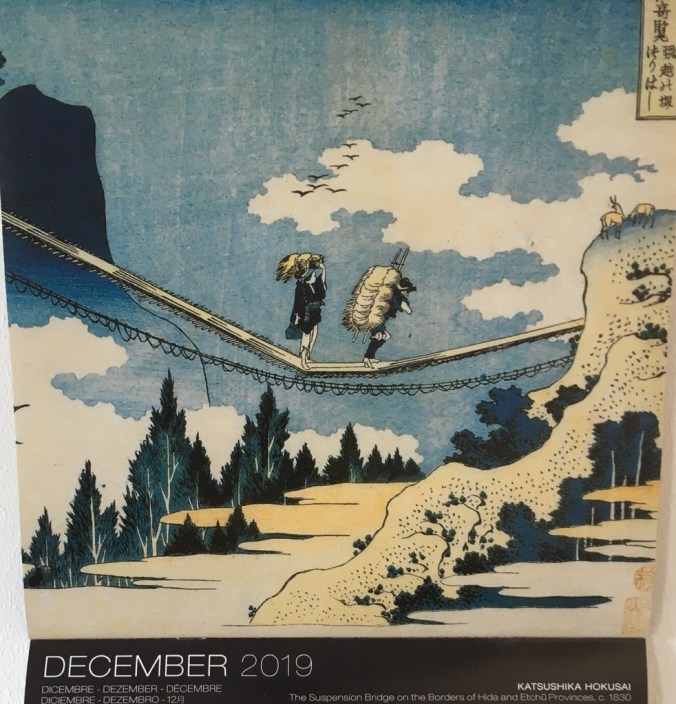 * December: Katsushika Hokusai. The Suspension Bridge on the borders of Hida and Etchu Provinces, c 1830