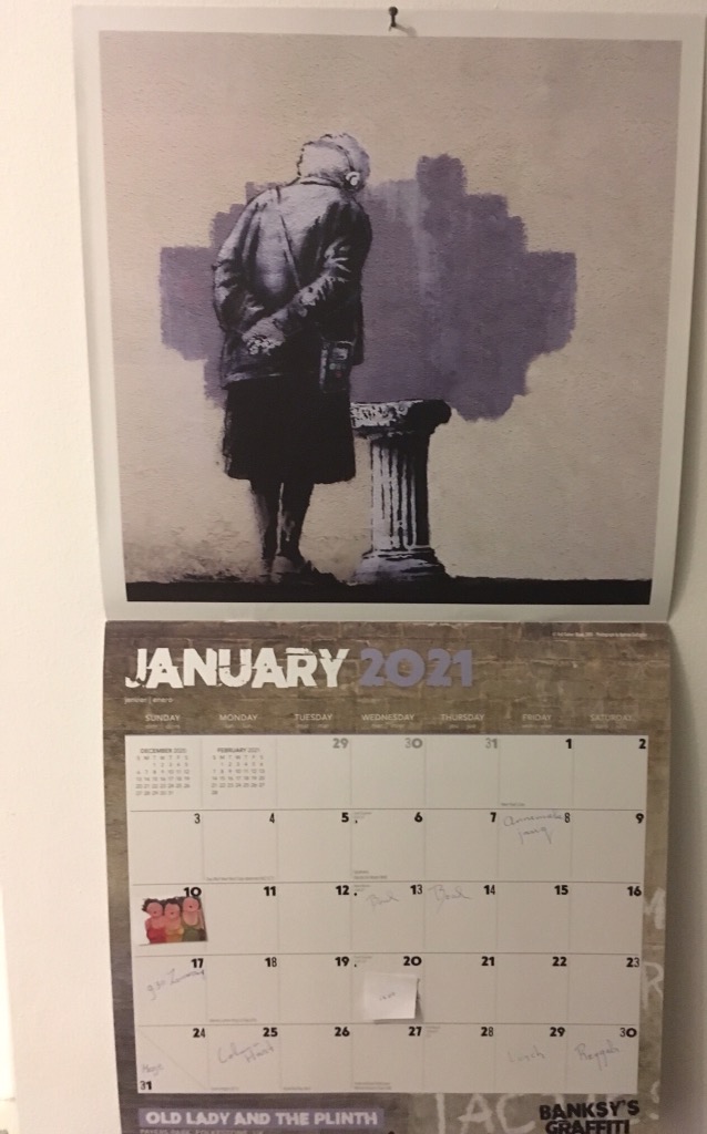Kalenderblad Januari Old lady and the plinth van Banksky