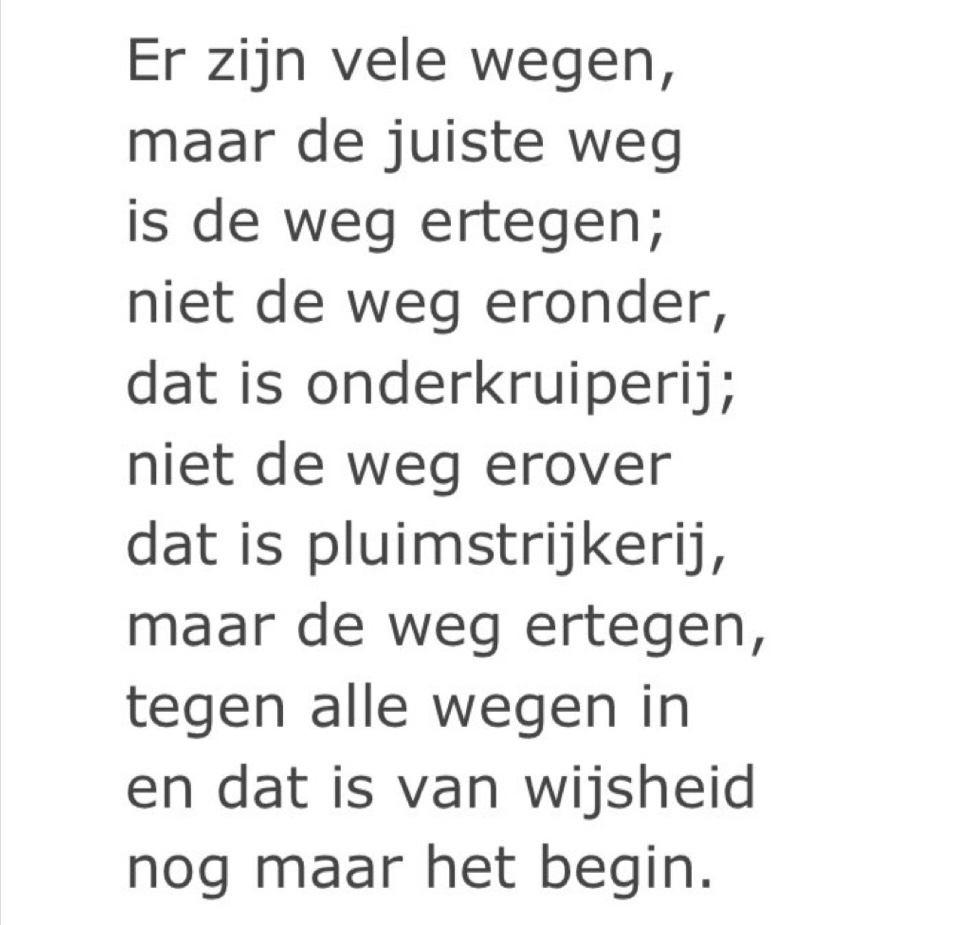 Dit gedicht van Bertus Aafjes stond op het bureau van Peter R de Vries. Jeroen Pauw las het voor in de speciale uitzending ter nagedachtenis aan de vermoorde journalist. Het typeert de man die in de eerste plaats herinnerd wilde worden als een goede vader. Ik zie er een gebalde vuist bij, een verbeten strijder. Zo wilde hij zijn. Zo wilde hij gezien worden. Oprecht zijn; rechtvaardig, standvastig, trouw.