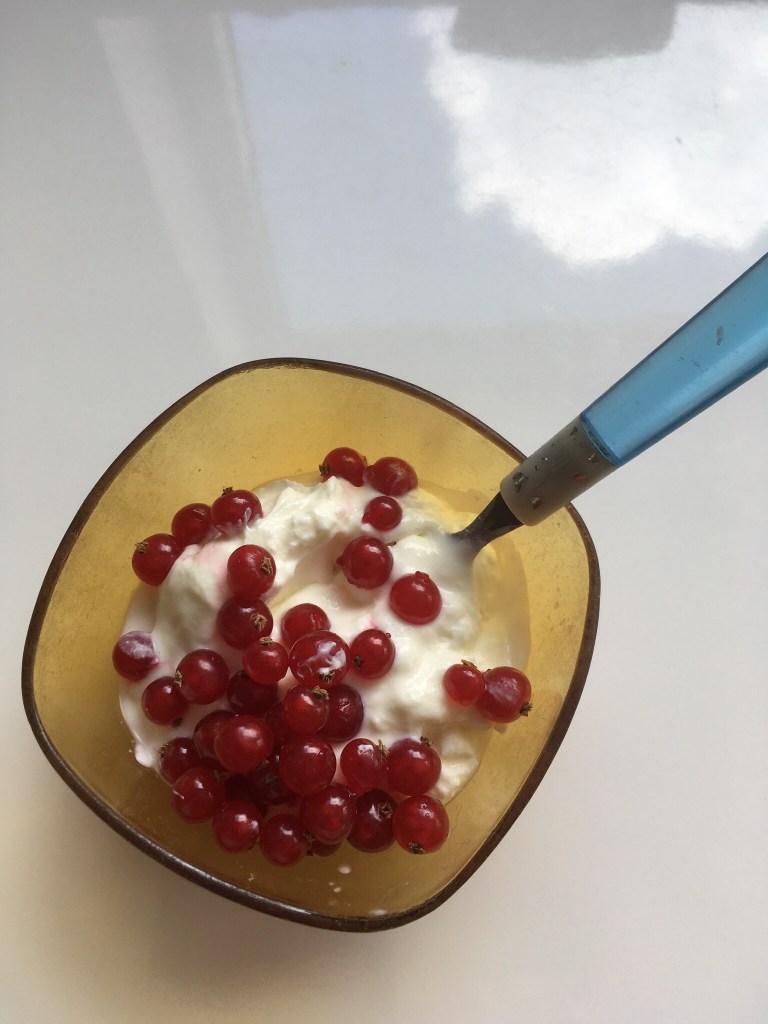 Rode besjes, aalbessen, ik haal ze nu ook af en toe. In een plastic doosje. Ik prak ze niet, doe er geen suiker bij. Doe ze over de kwark of de yogurt. Ze zijn supergezond lees ik op het etiket: rijk aan vezelstoffen en vitamine C en caloriearm. En! nog altijd niet te versmaden, heerlijk zijn ze. Ze zijn de zomer, de zon.