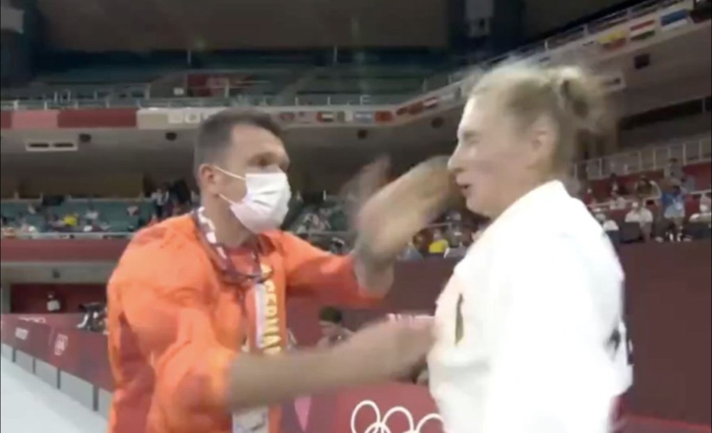 Onze dominee begon er de preek mee. De klap van de Duitse judoka coach. Het werd niet door de buitenwereld gewaardeerd dat judoka Martyne Trajdos, zijn pupil, voor aanvang van de wedstrijd door elkaar werd geschud en een klap in haar gezicht kreeg. Er kwam een heleboel commentaar op. Het leverde de coach een ‘ernstige officiële waarschuwing’ op. Martyne reageerde dat ze niets begreep van de ophef (het filmpje met de klap ging de hele wereld rond) :”Dat doen we altijd zo. Het is de manier om mij wakker te houden, mij scherp te houden”.