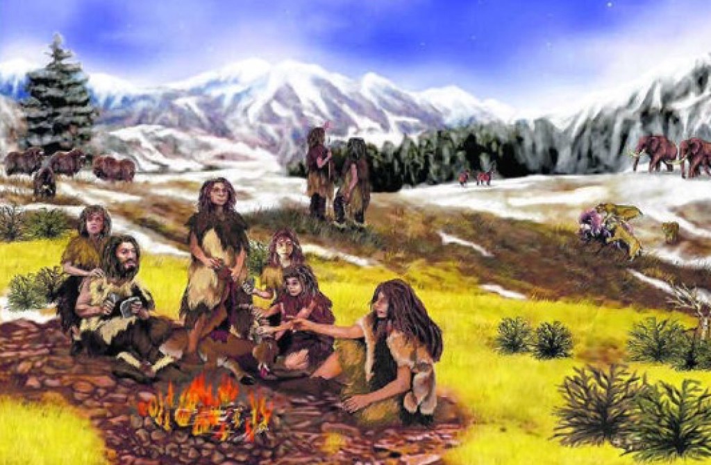 * Tekening van Neanderthalers 60.000 jaar geleden.