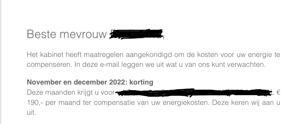 Vorige week kreeg ik bovenstaande mail van mijn energiebedrijf. De overheid wil mensen met hoge energiekosten compenseren. Dat is lovenswaardig want je zult maar zulke hoge energiekosten hebben dat je geen boodschappen meer kunt doen. Ook ik krijg dus dat bedrag van 2 maal 190 euro ter compensatie van mijn energierekening. Maar ik heb in de verste verte geen 190 euro aan energiekosten in de maand. En ik ben niet de enige die die compensatie helemaal niet nodig heeft. Daar staat tegenover dat er ook huishoudens zijn die aan die 190 euro lang niet genoeg hebben. Dat weet de overheid ook. Maar ‘het is niet uitvoerbaar om maatwerk te leveren.’ *