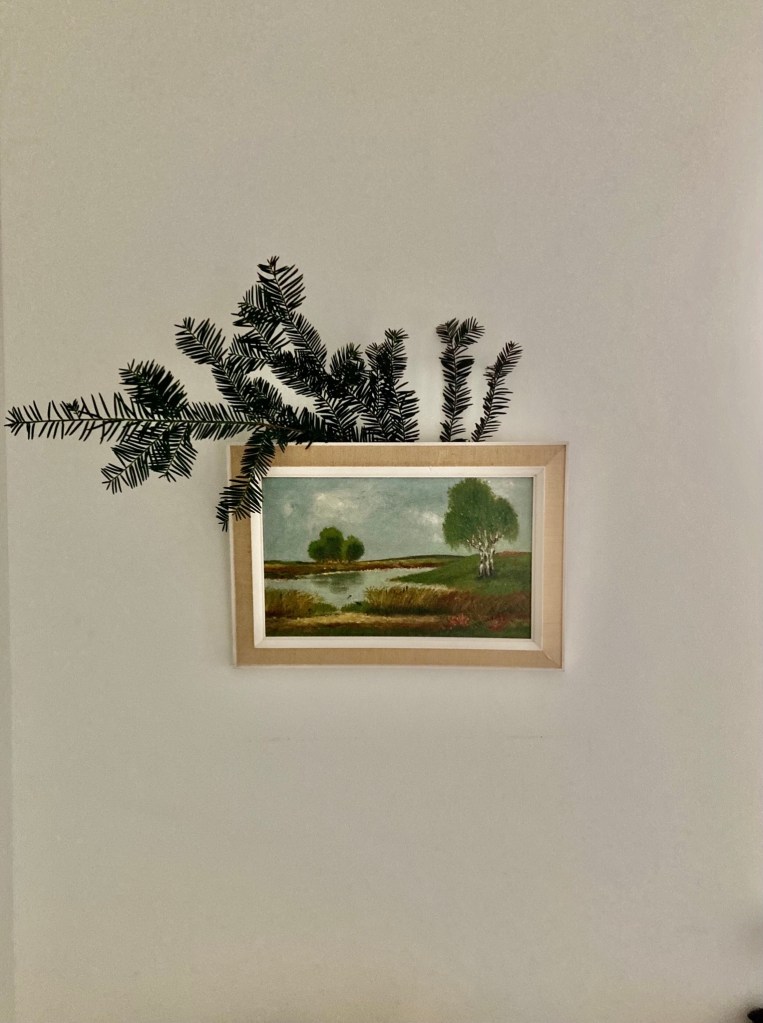 Vanmorgen heb ik uit het bos een takje groen meegenomen. Ik wilde eens kijken hoe dat ook weer staat. Een denne- of sparretakje boven een schilderij. Ik las dat Kees van der Staaij, voormalig SGP lid van de Tweede Kamer geen kerstboom had met kerst, maar dat een takje groen als versiering boven een schilderij bijvoorbeeld van hem wel mocht. Kerstbomen hebben niets te maken met de boodschap van kerst, kerstbomen stammen uit een heidense traditie aldus Kees. Een vooraanstaand theoloog reageerde daar weer op dat dat een broodjeaapverhaal is.