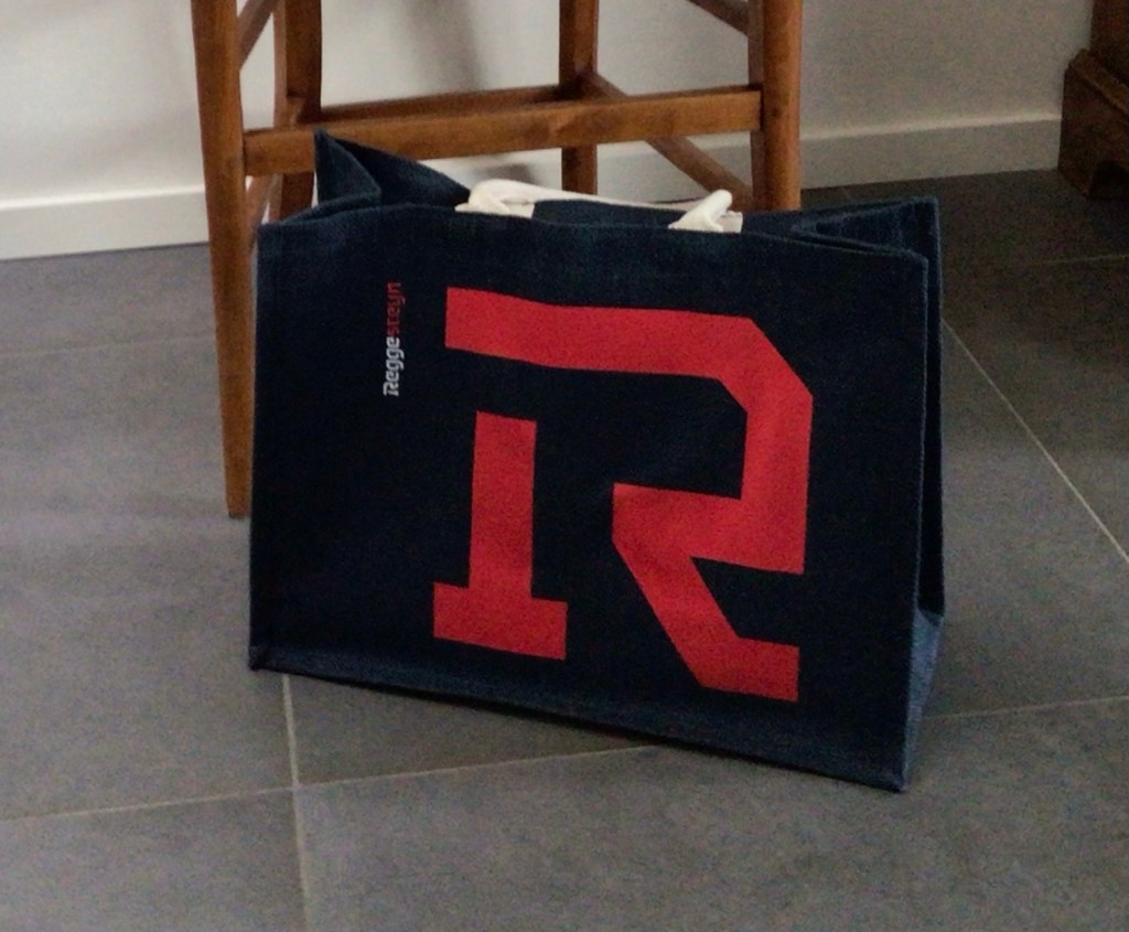 Na de reünie kregen we allemaal een tas mee. In de tas een beker, een pen, een notitieblok en snoepjes met het nieuwe logo. Een rode letter R van scholengemeenschap Reggesteyn in Nijverdal. De school waar we werkten als docent, in de leiding, als conciërge, bij de administratie of in een ondersteunende functie. De letter R op een donkerblauwe achtergrond. Ik zag in de letter R wel iets van de plattegrond van een slot of een kasteel en dacht dat het blauw zou kunnen verwijzen naar de Regge, al is het water van de Regge eerder bruin dan blauw