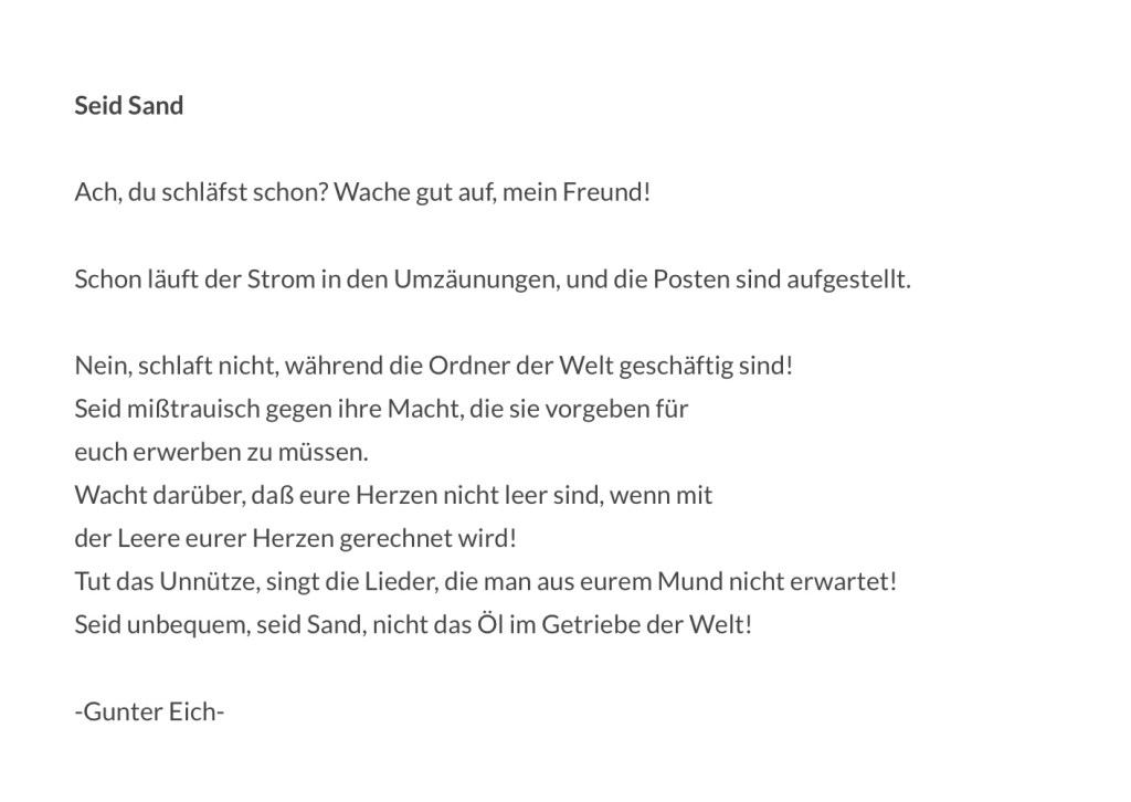 Er is een prachtig gedicht over zand, en met name de schurende eigenschap van zand. In het gedicht van Gunther Eich wordt de schurende eigenschap van zand toegejuicht. Wij worden door Eich opgeroepen om zand te zijn, niet olie. Een contrast met de oproep tot verbinding die je overal om je heen hoort. Ik las de woorden ooit ergens in Enschede op een deur van Artez. De woorden maakten toen zo’n indruk op mij dat ik er een foto van heb gemaakt en die foto jarenlang in het logo van mijn blog heb gebruikt. Ik heb de foto opnieuw geplaatst vorige week. Juist vanwege die woorden. Juist nu. Doe iets onbeduidends, zing een lied, dat niemand van jou zou verwachten, wees ongemakkelijk, wees het zand, niet de olie in het wereldse bedrijf.