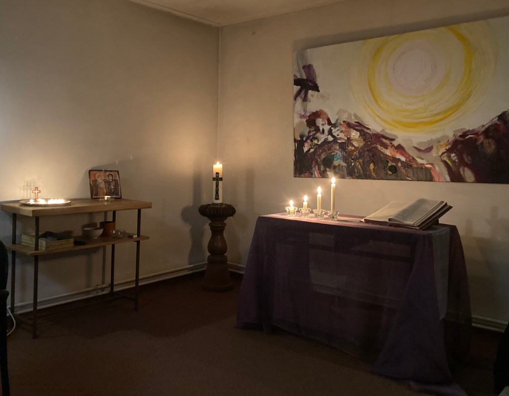 Koud was het vanmorgen. Ik hou er niet van. Ben er niet voor gemaakt. Opstaan in een koud huis. Het maakt me weemoedig. Beetje verdrietig. Het is sowieso een beetje droevige dag. Vanavond zal voor het laatst in De Kleine Kapel het avondgebed gehouden worden. Bijna zes jaar geleden werd begonnen met avondgebeden op een plaats die de naam kapel nauwelijks verdient. Een eenvoudig ingerichte ruimte achter een pastorie van de kerk aan de Noetselerweg in Nijverdal. Een grote kaars, kaarsjes, een kunstwerk, een oude bijbel, een goa stok, een tafel met stoelen, boekjes, schrijfmateriaal, een koffiezetapparaat en een waterkoker met wat daarbij hoort. Apparatuur voor muziek. Niks bijzonders eigenlijk. Een klein groepje gelovigen verzorgde de gebeden en organiseerde een aantal activiteiten. Het werd een soort van geloofsgemeenschapje dat er voor zorgde dat de kapel iedere dag open was voor willekeurige bezoekers die er even wilden verpozen. Er voor zorgden dat de kapel er netjes uitzag en dat de avondgebeden konden doorgaan. In de corona tijd iedere dag. Daarna een paar keer in de week. Het bleef een klein groepje, dat afwisselend uitdijde en afslankte, maar met een vaste kern. Een groepje dat haar thuis vond in de kapel.
