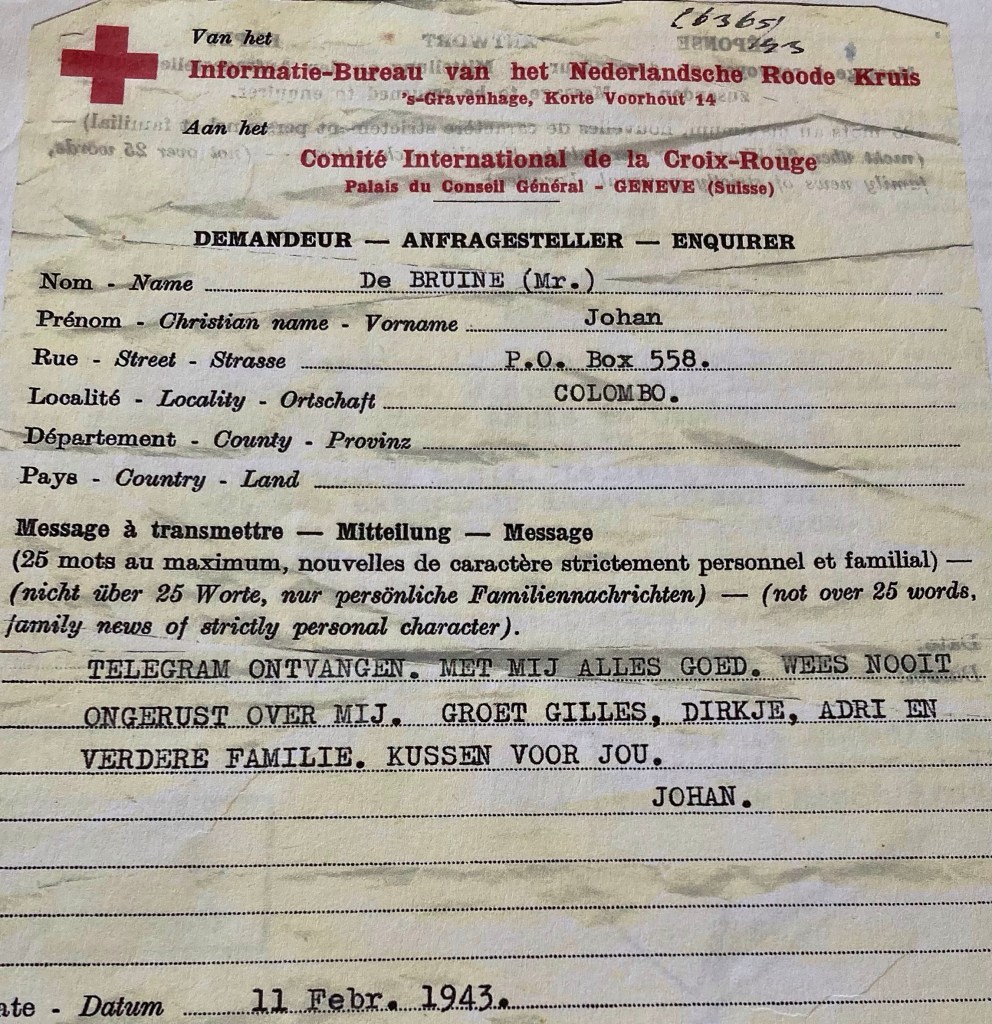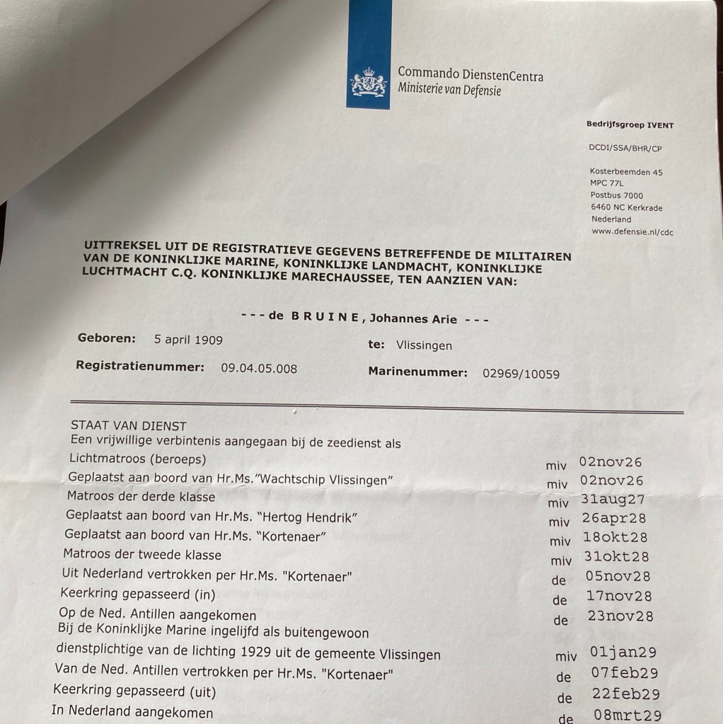 – – – De Bruine, Johannes Arie – – – was als 17-jarige het leger ingegaan als lichtmatroos. Een jaar later werd hij geplaatst op het wachtschip Vlissingen. Voor de oorlog was hij op verschillende schepen actief met name bij de Onderzeedienst, de OZD. Hij klom op van lichtmatroos tot kwartiermeester en werd in oorlogstijd bootsman. Nauwkeurig wordt tot 1942 vermeld wanneer de keerkring gepasseerd wordt. Dat was in 1928 de eerste keer. Op 13 maart 1942 passeert pa aan boord van de Abraham Crijnssen op weg naar Australie nogmaals de keerkring. En dan worden de gegevens vaag. Net als zijn brieven. Vanaf december 1942 tot mei 1945 was hij gestationeerd op de Hr. Ms. Willem van der Zaan. Het passeren van de keerkring wordt niet meer verteld. En dat moet toch regelmatig gebeurd zijn. Want ik lees op internet dat de Willem van der Zaan was toegevoegd aan het Britse Arabian-Bengal-Ceylon eskader. ‘De Willem van der Zaan escorteerde drie jaar lang individuele schepen en konvooien van en naar Colombo.Op 12 oktober 1944 vertrok de Willem van der Zaan richting het Verenigd Koninkrijk. De overtocht bracht het schip langs de havens van Bombay, Aden, Suez en Gibraltar. Op 16 november van dat zelfde jaar arriveerde het schip veilig in de monding van de Thames.’