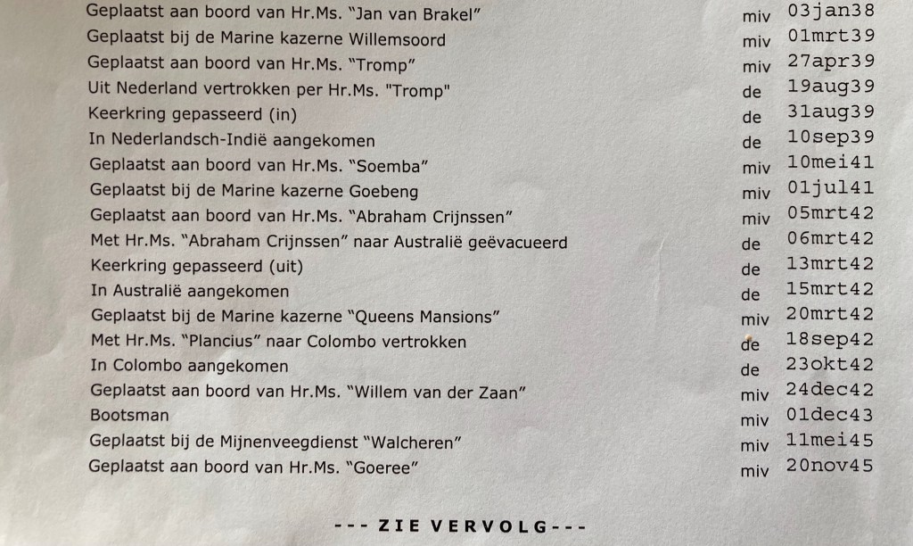 De vader had dan niets verteld, het ministerie van Defensie kon precies vertellen waar, wanneer marinenummer 02969/10059 geweest was in de oorlog. Tot op de dag nauwkeurig is er van iedere militair van de koninklijke marine, koninklijke landmacht, koninklijke luchtmacht c.q. koninklijke marechaussee een registratie van de staat van dienst.