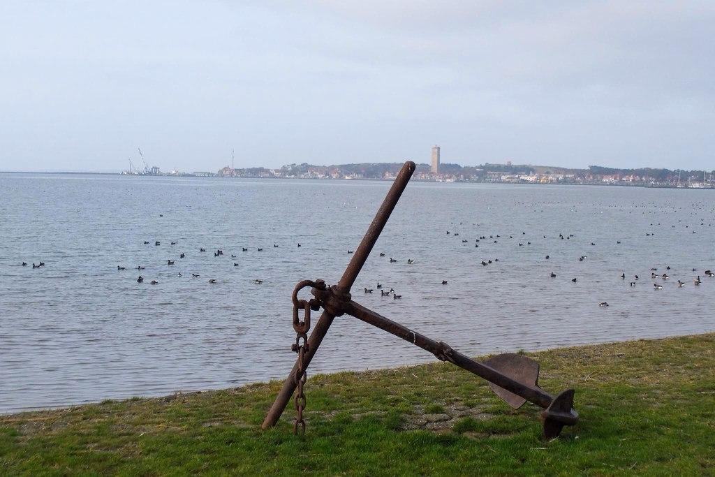 Wat ik wel goed kan is hard tegen de wind in fietsen of tegen de dijk op naar de zee. Het was een zware dobber geweest om dan eindelijk de zee te zien na een lange fietstocht. En om eerlijk te zijn, het viel me een beetje tegen. Ik zag de zee, ik rook de zee, maar ik hoorde haar niet. Ik kon niet even de zee voelen. Geen bruisende golven of golfjes over mijn blote voeten. Het was eb. Daar ver weg lag de zee als een blauwgrijs laken stil de zee te zijn. De ene zee is de andere niet.